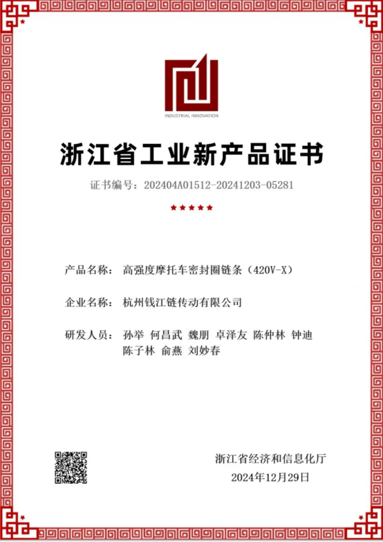 Hochfeste, ölgedichtete Motorradkette Modell 420V-O(X), entwickelt und hergestellt von Hangzhou Qianjiang Chain Industries Co., Ltd., besteht die Zertifizierung für neue Produkte auf Provinzebene